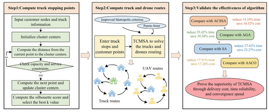 Having established the model above, we will now focus on the algorithms to solve the model. This section introduces a two-stage optimization algorithm, used to solve the TDCDRPTW model previously formulated. In the first stage, an adaptive k-means++ algorithm is employed to determine the truck stop locations. In the second stage, the identified stop points and their cluster assignments are input into the TCMSA algorithm for collaborative route optimization between trucks and drones. To verify its effectiveness, the proposed approach is compared with traditional routing models: Adaptive Cooling Schedule Simulated Annealing (ACSSA), the Adaptive Genetic Algorithm (AGA), SA, and the Adaptive Ant Colony Optimization (AACO) algorithm. The detailed design and procedure of the two-stage algorithm will be elaborated in the subsequent sections. The algorithm’s structure (see Step 1 and Step 2) and evaluation (see Step 3) are shown in Figure 3.