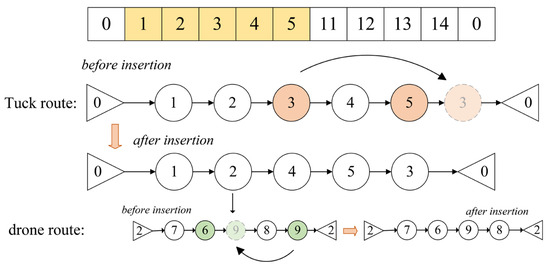 The TDCDRPTW is a variant of the VRP [38]. Heuristic algorithms generally offer significant advantages in terms of computational speed, particularly for medium-to-large-scale problems. Among these, the SA method is prominent due to its efficiency and effectiveness especially. SA functions as a heuristic algorithm that incorporates stochastic elements to simulate the physical annealing process. Its core principle involves iteratively generating new candidate solutions from an initial solution, evaluating these options, and probabilistically accepting suboptimal solutions based on a predefined probability. As the “temperature” of the system decreases, the likelihood of accepting inferior solutions also diminishes, guiding the process toward a satisfactory optimization solution. However, traditional SA can encounter challenges such as extended computation times and difficulties in determining the best initial temperature T. To address these issues, this paper proposes TCMSA, which enhances the conventional SA approach by refining the initial temperature function, improving the Metropolis criterion, and introducing a new probability formula. Meanwhile, this paper also tracks the best solution at each temperature to prevent loss. The construction of the truck–drone path will be discussed below. The pseudo-code of the TCMSA algorithm is presented in Algorithm 2.