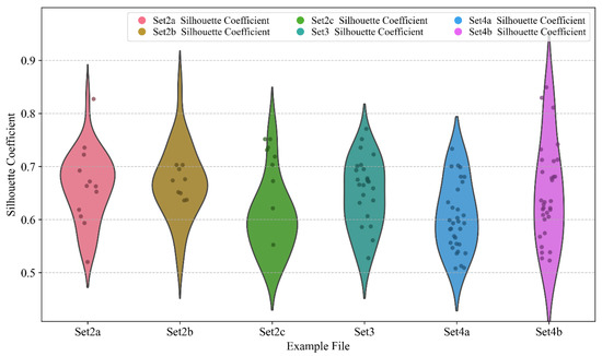 As shown in Figure 8 and Figure 9, the silhouette coefficients exceed 0.5 with fluctuations around 0.6 for all examples. Several examples even exceed a silhouette coefficient of 0.8. The DBI values are all below 1, with most of them being less than 0.5. The CH values are all above 100, with the majority exceeding 500. This indicates that the self-adaptive k-means++ algorithm we employed demonstrates a favorable performance.