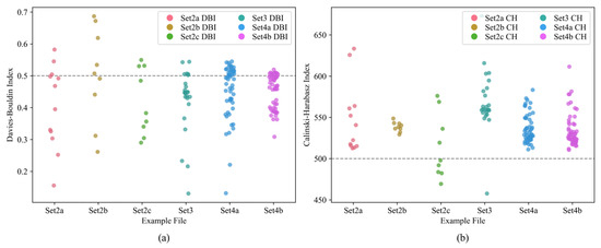 The DBI and CH index of all examples. (a) Davies–Bouldin Index of all examples; (b) Calinski–Harabasz Index of all examples.