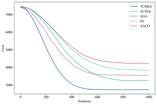 The objective function value, initial iteration speed, solution variation, and convergence rate of TCMSA outperform those of ACSSA, SA, AGA, and AACO. Therefore, TCMSA demonstrates superior solution quality.