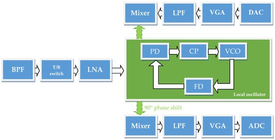 With the ongoing development of wireless communication technology, the design of reconfigurable RF integrated circuits (ICs) has become a crucial focus area for next-generation wireless sensing platforms. One of the most essential components of every wireless transceiver is the bandpass filter (BPF). Figure 1 presents the transceiver front-end circuit positioning a BPF as the first component in the processing chain. The BPF is directly integrated with the antenna without the inclusion of intermediary components, ensuring seamless and unimpeded interaction with the received signal. Upon reception, the antenna transmits the sensed signal to the BPF, which either selectively passes the desired frequency range or attenuates unwanted signals outside the target bandwidth. This filtering process ensures the integrity of the signal passed to the subsequent processing stages.