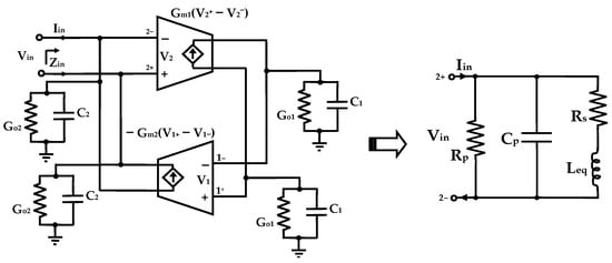 Since the input/output impedances of the transconductors in the gyrator-C network are inherently limited, the synthesized equivalent inductor exhibits a lossy behavior. Equation (2) is characterized by the presence of parasitic components, including resistance and capacitance, which degrade the ideal inductive response. The behavior of the lossy inductor can be modeled by the equivalent RLC network, as illustrated in Figure 2, and its equivalent circuit parameters are derived from the small-signal analysis of the gyrator-C network. These parameters are calculated as follows:
