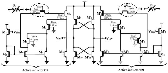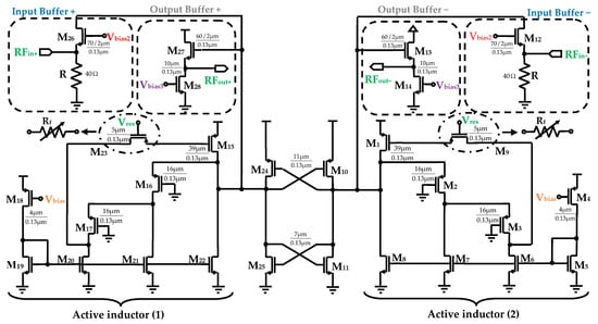 The configuration of the proposed differential active inductor, computed using the design custom method, is shown in Figure 3. It comprises two grounded active inductors coupled through two cross-coupled transistor pairs that form negative resistances. Each inductor consists of three transistors M1, M2, M3 for AI-1, and M15, M16, M17 for AI-2, providing the basic inductance functionality.
