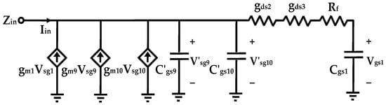 To overcome the loss limitations, a feedback resistance is frequently employed to mitigate the parasitic series resistance, which adversely affects the Q-factor of the active inductor []. This approach introduces a parallel effect on both the series resistance and the inductance. Consequently, the feedback resistance simultaneously decreases the series loss resistance and enhances the emulated inductance Ls, theoretically driving Q toward infinity. Moreover, the feedback mechanism serves to fine-tune the phase of the input admittance and the self-resonant frequency (SRF), thereby optimizing the active inductor’s operating frequency at which Q achieves its maximum value.