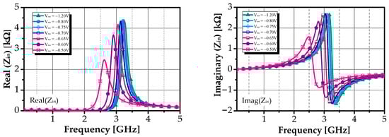 The variation in Rf is achieved by adjusting Vres from −0.5 V to −1.2 V. Under these conditions, Leq was found to range between approximately 33 nH and 98 nH. Additionally, the circuit exhibited self-resonance frequencies of up to 3.3 GHz.