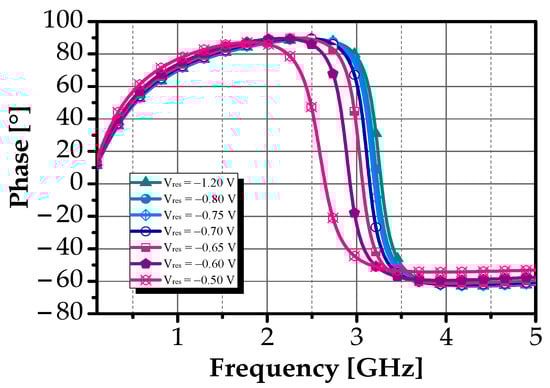 To further validate the inductive behavior of the circuit, a detailed analysis of its phase characteristics was conducted. As shown in Figure 9, when Vres was set to −0.7 V, the phase approached 89.85° across the entire operating frequency range, confirming that the circuit maintained its inductive behavior within this band. For frequencies beyond 3.3 GHz, the reactance component of Zin becomes negative, indicating a transition to capacitive behavior.