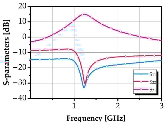 In Figure 10, the simulated S-parameters of the filter are presented under its fourth tuning state (see Table 1), providing valuable insight into the circuit’s performance. This piece of detail is usually missing in the state-of-the-art of active BPF. However, their behaviors were imported for evaluating the stability characteristics and the input and output impedance matching of the design. The proposed BPF is centered at 1.228 GHz and exhibits an input reflection coefficient (S11) and an output reflection coefficient (S22) of −33 dB and −31 dB, respectively, indicating excellent impedance matching and optimal power transfer across the filter’s passband.