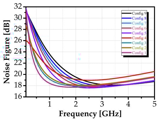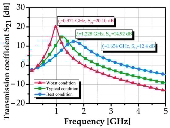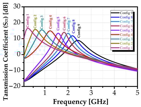 Figure 11 illustrates the variation in the transmission coefficient S21 response. The results demonstrate that the center frequency fc can be effectively tuned from 0.28 GHz, to 2.426 GHz, by adjusting the values of Vres and Vbias2 according to the configuration settings listed in Table 1, spanning Config 1 to Config 9. A maximum forward transmission coefficient (S21) of 16.54 dB was achieved at the center frequency of 0.28 MHz, i.e., Config 1, indicating optimal signal transmission.