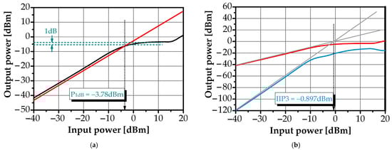 The linearity of the BPF was evaluated using the 1 dB compression point (P1dB) and the third-order intercept point (IIP3). To assess its performance, two-tone signals with a spacing of ±2.5 MHz were applied. As shown in Figure 13a,b, the P1dB distortion point was achieved at an input power of −3.78 dBm, while the IIP3 was measured at approximately −0.897 dBm. These results demonstrate that the proposed active filter exhibits high linearity, making it well-suited for multiband applications in integrated circuit design.