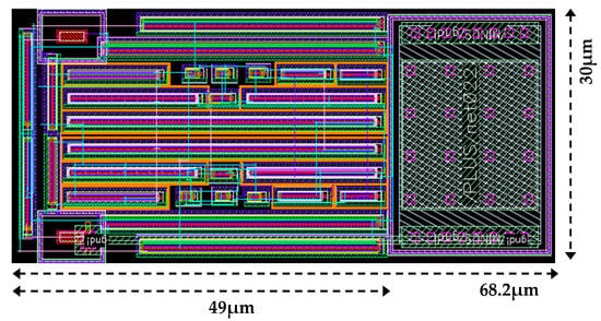 For optimal matching of input and output impedance, the transistors in the input buffer M12 and M26 were sized with a W of 70 μm, L of 0.13 μm, and Nf = 2, after optimization. To achieve input-impedance matching of 50 Ω, a resistor R with a value of 40 Ω is incorporated, eliminating the need for additional capacitors or inductors. In the output stage, a second impedance-matching circuit is crucial to ensure maximum transfer power and to mitigate the impact of the load on the filter’s frequency response and quality factor. To match the output impedance to 50 Ω, a 600 fF metal-insulator-metal (MIM) capacitor is integrated into the output buffer. Furthermore, the output stage transistors M13 and M27 are sized with a W of 60 μm and Nf = 2. The gate-to-source voltage Vgs of the cascode stages (M2, M3, and M16, M17) is set to ground (GND) to simplify the design.