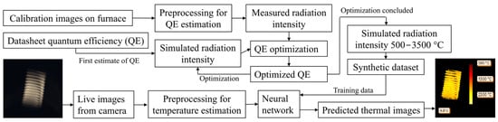 The proposed method involves two main stages: a calibration phase for quantum efficiency (QE) optimization and a temperature estimation phase using a trained neural network. In the first stage, calibration images are acquired by imaging an Inconel 718 plate heated in a furnace across a known temperature range. An initial estimate of the camera’s spectral quantum efficiency is obtained from manufacturer datasheets. To account for the limited dynamic range of industrial cameras in the calibration phase, multiple images with varying exposure times at the same temperature are acquired. The calibration images are then preprocessed to extract measured radiation intensities, which are compared with simulated intensities based on Planck’s law and the initial QE estimate. A numerical optimization procedure is used to adjust the QE curve to minimize the discrepancy between measured and simulated data. The resulting optimized QE is subsequently used to simulate spectral radiation intensities over a wide temperature range (500−3500 °C), generating a synthetic dataset for the expected radiation intensities.
