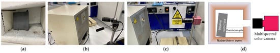 (a) Inconel 718 substrate inside the furnace. (b) Experimental setup for color camera calibration. (c) Experimental setup for multispectral camera calibration. (d) Sketch of the experimental setup.