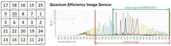 Demosaicing scheme and quantum efficiency (QE) from the datasheet of multispectral camera. The infrared pass BP800 filter limits the spectral active range to 700–1000 nm.