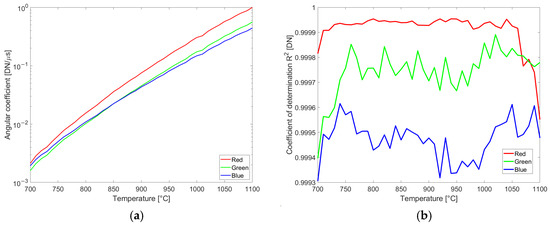 Results obtained by fitting gray levels of red, green, and blue bands of the color camera versus exposure time. (a) Angular coefficient of the fitting line of gray level (log scale) vs. temperature. (b) Coefficient of determination R2 versus temperature.
