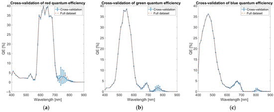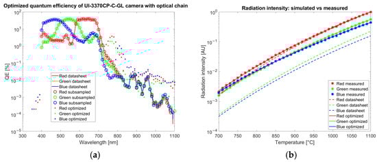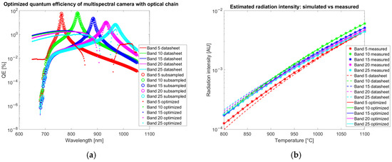 The QE of the cameras [37] is measured according to the EMVA 1288 standard [38]: monochromatic light of known intensity is conveyed on the sensor by a monochromator, scanning the wavelength. The intensity of the signal generated by the camera is collected for each wavelength and each band. The procedure requires specific instrumentation, dedicated labs, and optical expertise [17,30]. Alternative methods infer QE from several light-emitting diodes with different peak emission wavelengths [39] or sets of filters [40] or infer it with deep learning networks [41]. These methods require dedicated tools and provide limited precision. Therefore, a method specifically dedicated to optimizing QE for temperature calibration that is strongly sensitive to the near-infrared region of the spectrum between 700 and 1000 nm is not available.