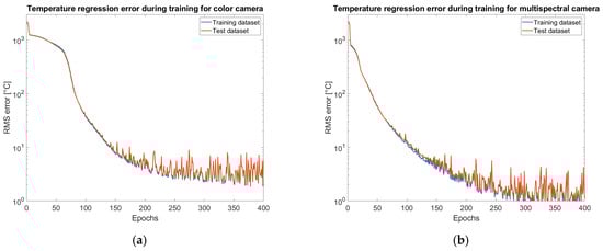 Each image of the synthetic dataset has a width equal to 1 pixel and height equal to the number of bands of the camera, representing the simulated radiation intensities that could be observed at a specific temperature . The training data, corresponding to the Planckian locus, are generated by Equation (3) with optimized QE providing . Simulated data are normalized to cancel the dependence on emissivity, exposure time and experimental setup. The training data for the color camera are stored in an array of two-element tuples obtained by dividing the red and blue simulated data by green . The green over green ratio, equal to 1, is discarded. Equation (7) shows that normalization of simulated data cancels the effects of the optical configuration and of the emissivity in a graybody approximation.