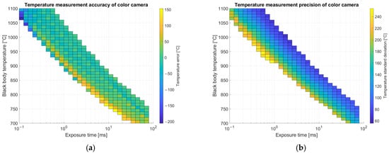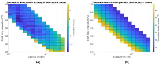 The data reported in Figure 11, Figure 12, Figure 14 and Figure 15 show that the biggest source of uncertainty in temperature measurement is the effect of exposure time. The dynamic range of an 8-bit camera seems too limited to capture the variability of the intensity generated by glowing objects. In Figure 11 and Figure 12 a wide portion of the plot does not report the temperature measurement because the signal of at least one of the bands is too dim or saturated. In future works, a high dynamic range camera will be tested to improve robustness towards exposure time variation. Temperature measurement at different exposure times appears different, generating an uncertainty reported in Table 3 of 63.2 °C for the color camera and of 24.3 °C for the multispectral one. This uncertainty is attributed to the instability of the dark level, to the shot noise of the sensor, and to the quantization error. The first adds a bias to the signal, the second adds white noise on each reading and the last becomes relevant when exposure time is not optimal. The sources of uncertainty sum up influencing the data provided to the neural network and, therefore, the temperature estimation. A high dynamic range camera could reduce signal quantization uncertainty, potentially improving temperature measurement precision.