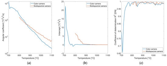 The goal of preprocessing is to prepare the experimental data representing the average gray values measured on calibration images versus band, temperature, and exposure time for the optimization step of . Dividing the average gray value measured on the calibration images by exposure time is not accurate, due to the uncertainty in the dark level, even after dark image subtraction. Therefore, an alternative approach based on images acquired with multiple exposure times is proposed. First, the average gray values collected for the same temperature and the same band are grouped and plotted versus exposure time. Then, pixel intensities near saturation (here set above 240), and too dark (below 10), are discarded. On the remaining data, a least squares fitting of a line is performed. The angular coefficient is an accurate estimation of the thermally generated signal evaluated at the calibration temperatures . Plots of angular coefficients and coefficients of determination R2 for the color camera are reported in Figure 6.