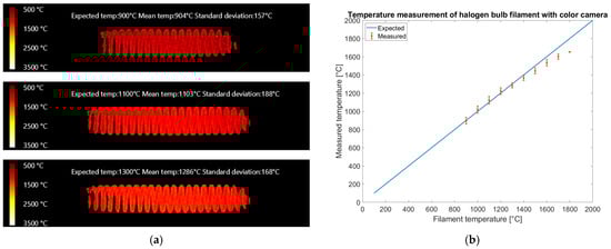 The color camera generates temperature images (Figure 14a) with higher spatial resolution than the multispectral camera (Figure 15a), allowing the visualization of the wires of the coil. This could be explained considering that the pixel size of both cameras is 5.5 and that the magnification provided by the lens is roughly the same, but the multispectral camera requires a subregion of 5 × 5 pixels of the sensor to generate a temperature read while the color camera, thanks to the debayering algorithm with interpolation, generates a temperature read for every pixel. On the multispectral camera, the distance among sampling regions for the different bands is much bigger than on the color camera, and this could be critical when sharp temperature edges are present. In the multispectral camera the bands in the subregion used for temperature estimation may observe regions of the sample at different temperatures, potentially generating false temperature readings. Nonetheless the operating range of the multispectral camera is wider, covering the temperature range from 1000 °C to 2500 °C, while the color camera is limited to 1800 °C. The color camera works in the visible spectral range (400–700 nm) while the multispectral works in the near infrared (700–950 nm). In the latter, the intensity variation with temperature is lower, allowing a wider temperature range. Nonetheless, the color camera provides higher spatial resolution at a lower equipment cost and requires fewer processing steps than the multispectral one. The advent of extremely wide dynamic range color cameras for automotive could increase the temperature range while keeping the other advantages. An overall limitation of the color camera regards interference of ambient light, therefore low-temperature measurements (below 1000 °C) are possible only in a dark environment. The multispectral camera is more robust in this regard, since in lab or industrial environments near-infrared light is usually absent.