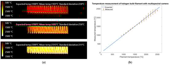 The results reported in Figure 15 show that the multispectral camera could measure up to 2600 °C, although uncertainty starts increasing above 1800 °C due to the saturation of some bands. Different from the color camera, a limited number of saturated bands have been accepted in the processing at the price of higher uncertainty. The reference temperature is within error bars up to 2400 °C, showing that our calibration method generalizes above the calibration range (700–1100 °C). The rms error on filament temperature prediction, evaluated on the entire dataset of 123 valid images up to 2600 °C, showing at least 50% of the filament neither saturated nor dimmed, is 45.8 °C. Limiting the temperature range to 1000–1400 °C, as the color camera, 46 valid images remain with rms error on temperature prediction reduced to 31.0 °C.