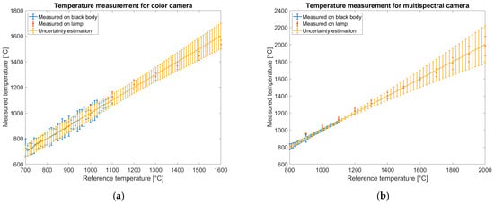 The overall comparison of temperature measurements using both the color and multispectral cameras is presented in Figure 16. Each plot shows measurements performed on the blackbody source and the lamp, along with the estimated Type B uncertainty, as described in Section 2.9. Blackbody images are acquired in the temperature range of 700 °C to 1100 °C for the color camera and from 800 °C to 1100 °C for the multispectral camera. The uncertainties for experimental data are estimated based on the standard deviation of the measured temperature within the region of interest. From the data shown in Figure 11b and Figure 12b, only the measurement corresponding to the optimized exposure time is reported. For the lamp, the data reflect the statistical uncertainty of the measurements.
