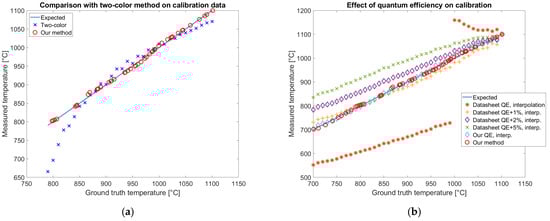 (a) Comparison of our results in calibration with the two-color method. (b) Comparison of our results in calibration with direct estimation of the temperature from the simulated Planckian locus with interpolations for several quantum efficiency datasets.