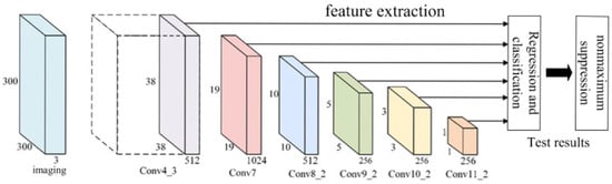 The SSD network model architecture consists of three main components: the base network, feature extraction network, and detection network. This model improves the classical VGG16 to suit target detection tasks. To preserve the full spatial feature location information and avoid the spatial abstraction of fully connected layers, SSD replaces the last two fully connected layers of VGG16 with convolutional layers, named Conv6 and Conv7. The model then introduces four additional convolutional layers—Conv8, Conv9, Conv10, and Conv11—alternating between different kernel sizes (1 × 1 and 3 × 3) to downscale and extract features. A multi-scale feature network is created by fusing feature maps from Conv4_3 and Conv7, along with subsequent layers (Conv8_2, Conv9_2, Conv10_2, and Conv11_2), forming a feature pyramid structure [21]. In the detection network, each layer’s feature maps are processed with two 3×3 convolutional kernels: one for predicting target category confidence and another for generating positional regression information. These outputs are aggregated and fed into the loss layer for optimization, with the final detection results refined through non-maximum suppression (NMS). Figure 3 illustrates the basic structure of the SSD network model.