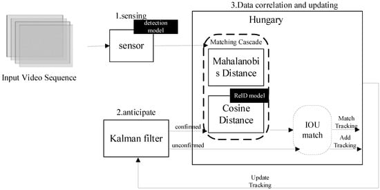 To extract the motion state of vehicles passing through a dynamic weighing area, vehicle tracking is required. With advances in target detection technology, detection-based tracking methods have become the mainstream in multi-target tracking. The SORT algorithm combines the Kalman filter with the Hungarian algorithm, using the intersection-over-union (IoU) as the cost matrix in the Hungarian algorithm, offering an efficient tracking strategy. However, this algorithm overlooks the role of visual features in target matching, which can lead to identity switch errors during occlusion and disrupt tracking continuity [23]. To address this issue, the DeepSORT algorithm integrates dynamic and appearance information as matching criteria and employs a cascade matching strategy, effectively reducing identity switches and tracking loss [24], as shown in Figure 4.