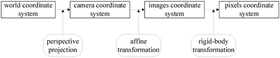 The vehicle tracking method based on SSD and DeepSORT proposed in this paper extracts the trajectory and speed information of the vehicle. To achieve this, the vehicle’s position in the pixel coordinate system must be converted to real-world coordinates. We employ a GPS-based camera calibration method to map the target’s position on the camera screen to its real-world position. Specifically, the distance the vehicle moves per unit time on the screen is mapped to the actual distance, allowing the calculation of speed and trajectory information [26]. As shown in Figure 5, the method involves transformations between the world coordinate system, camera coordinate system, image coordinate system, and pixel coordinate system.