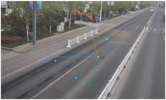 To establish the world coordinate system, a reference point is chosen as the origin (O), with the x-axis directed north, the y-axis directed east, and the z-axis perpendicular to the ground. This forms a local coordinate system tangent to the Earth’s surface. Since the road surface in front and behind the dynamic weighing system is typically flat, this paper defines the section of the road as the plane z = 0 and converts the GPS coordinates of all points to this coordinate system for subsequent transformation and analysis.