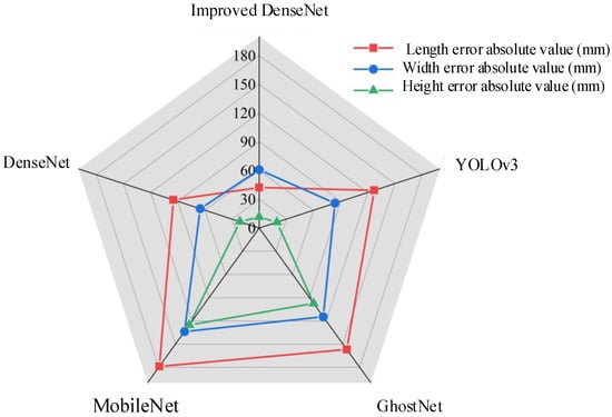 To verify the performance advantages of the improved DenseNet, a comparison is made with other commonly used network models on the same dataset. Table 2 presents the loss function, FLOPs, and the number of parameters for YOLOv3, MobileNetV1, GhostNet, DenseNet, and the improved DenseNet during training. The model proposed in this paper achieves the highest recognition accuracy. Although its number of parameters and FLOPs are not as efficient as the lightweight MobileNet and GhostNet, it shows significant advantages over YOLOv3 and the original DenseNet. Furthermore, it reduces the network’s parameter count and increases speed while maintaining high accuracy. Figure 9 shows the absolute errors of the Tesla Model 3 predictions by the five models on the same dataset, with the proposed model outperforming the others in terms of accuracy.