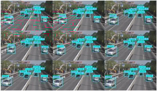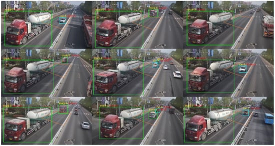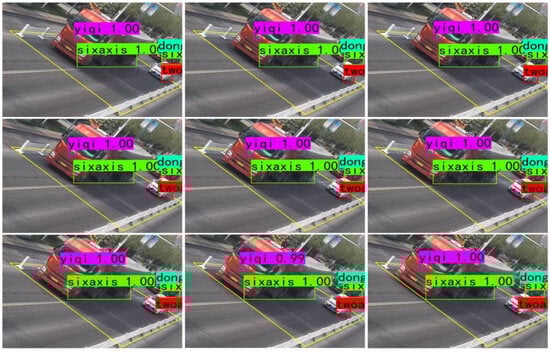 To verify that the detection model performs well in other time periods of the dynamic weighing area, surveillance video data from different periods were re-collected for experimental validation. The results show that the model accurately detects the vehicle label and axle type of vehicles passing through the dynamic weighing area, with no omissions or misdetections. As shown in Figure 11, the detection results for nine consecutive frames of a vehicle passing through the dynamic weighing area are presented.