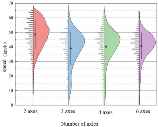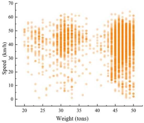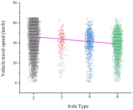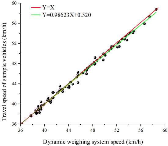 To explore the relationship between the dynamic weighing system dataset and the vehicle traveling state information dataset, quantile statistical plots were created. Figure 20 shows the quantile plots comparing the vehicle speeds in both the dynamic weighing system data and the vehicle traveling state data. Each black dot represents the vehicle speed at each frame as the vehicle passes through the dynamic weighing area, while the horizontal axis represents the average speed of the vehicle through the dynamic weighing area, as measured by the dynamic weighing system. The red line, with a slope of 1, indicates that points along this line represent a speed distribution in the vehicle traveling state data that exactly matches the distribution in the dynamic weighing system. The black dots fluctuate above and below the red line and do not align exactly with it. From this, it can be reasonably inferred that the speed distributions in the dynamic weighing system and the vehicle traveling state data are very similar in shape, with only slight differences in scale and location. This paper uses linear regression to quantitatively describe the relationship, expressed as y = 0.98623x + 0.520. This further demonstrates that the variation in the vehicle’s driving state through the dynamic weighing area, and its effect on weighing accuracy, is related to the vehicle’s driving speed. The final analysis reveals that the correlation between vehicle weight and vehicle speed is stronger than the correlation between vehicle weight and vehicle classification or size.