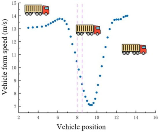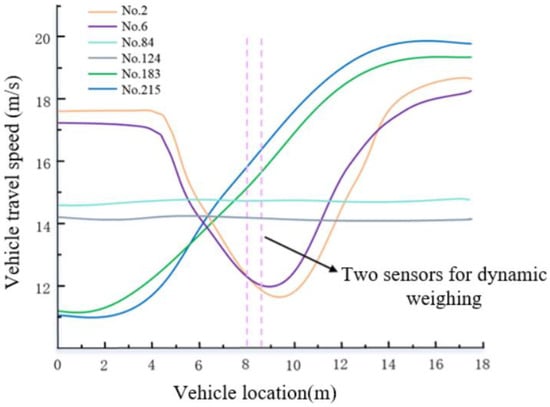 Observation of Figure 21 shows that as the vehicle speed gradually decreases, the points on the trajectory become increasingly compact. Despite this, the vehicle’s path remains largely consistent. Due to the different driving characteristics of various vehicles, their speeds and deceleration behaviors as they pass through the dynamic weighing area vary. A comparative analysis of the collected data reveals that the deceleration behavior of vehicles entering and exiting the dynamic weighing zone significantly impacts the accuracy of the weighing results.