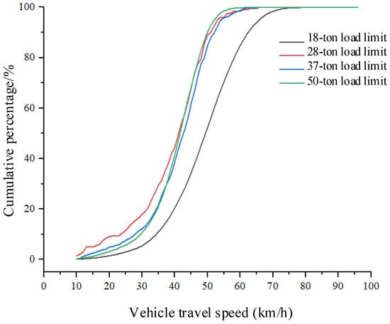 Consistent with the results of the initial cement tanker experiment, the system provided accurate weighing results when the truck traversed the dynamic weighing area under smooth or accelerated conditions. Even when accelerating, the system maintained high measurement accuracy. This phenomenon can be attributed to two main factors: First, the truck’s center of gravity is typically located near the rear axle, and the spacing between the rear axles is relatively short, usually less than the distance between the load cells. As a result, the center of gravity does not shift significantly during the weighing process, contributing to stable weighing data as the vehicle passes through the area. Second, analysis of the driving data from a large number of vehicles reveals that the acceleration of most vehicles when crossing the dynamic weighing area is limited. This means that the vehicle’s speed change is not too abrupt, which facilitates the accurate capture and processing of weighing information by the system, as shown in Table 10.