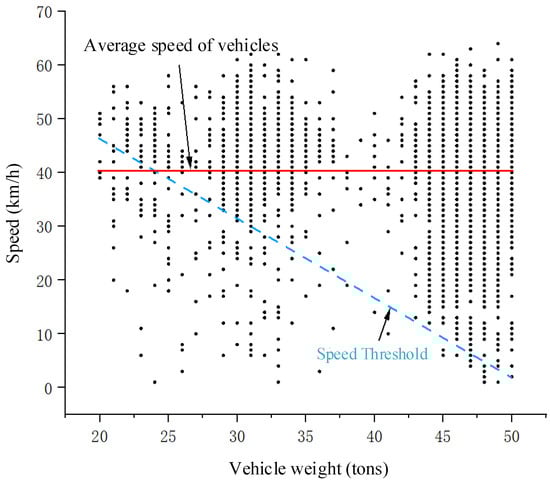 The data fusion technique known as the Monte Carlo method was employed to create a comprehensive dataset that retains the factors distributed across the sub-datasets. In brief, the Monte Carlo method allows for the presentation of the correlations between key features in the individual datasets [34]. This method uses random sampling to obtain the weights and speeds of vehicles in the dynamic weighing dataset and compares the random sampling results of all weighing data with the vehicle-related information from the vehicle label and axle type dataset, as well as the driving status dataset. If the sampled vehicle speed in the dynamic weighing dataset is below the percentage value of the vehicle speed interval in the driving status dataset, the vehicle is classified into the normal driving group. Conversely, if the sampled vehicle speed exceeds the percentage value in the driving status dataset, the vehicle is classified into the abnormal driving group.
