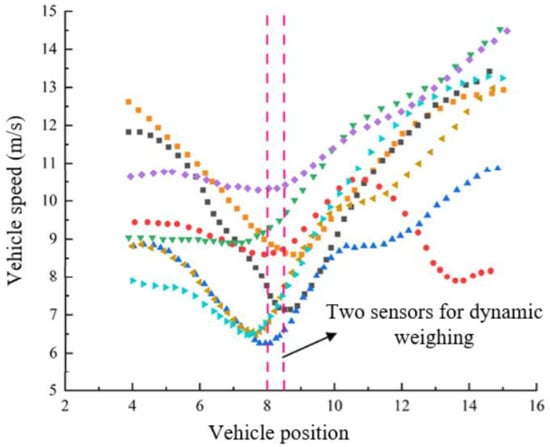Figure 21 shows a plot of the positions and speeds of eight trucks as they pass through the dynamic weighing detection area, undergoing a process of deceleration followed by acceleration. The two vertical lines in the figure represent the two dynamic load cells installed on the road.