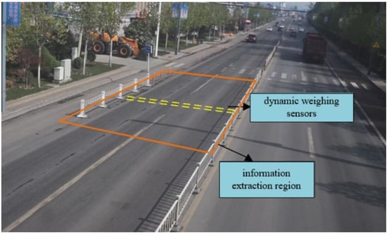 The vehicle motion state information extraction method presented in this chapter aims to accurately capture the trajectory and speed changes of a vehicle as it passes through the dynamic weighing area. Using a detection-based online multi-target tracking method, vehicles on the road are first identified using a target detection algorithm, and then the tracking algorithm is employed to extract their trajectory and speed information. To enhance the accuracy of extracting the trajectory information of vehicles passing through the dynamic weighing area, this paper defines a fixed motion state extraction zone based on field research results. As shown in Figure 25, the dynamic weighing monitoring area is defined as a rectangular zone measuring 8 m by 18 m, with the dynamic weighing sensor positioned at the center of this zone. This method effectively extracts vehicle trajectory and speed change information from monitoring videos, providing crucial data support for the dynamic weighing system.