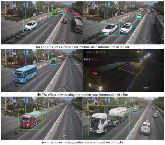 To verify the effectiveness and reliability of the method proposed in this paper, several different types of vehicles were randomly selected, and their motion state information was extracted within the dynamic weighing area. Figure 26 shows the results of the motion state information extraction for different vehicle types: (a) motion state information for cars; (b) motion state information for buses; and (c) motion state information for trucks. As shown in the figures, even under low light conditions at night, the proposed method accurately captures the motion state information of vehicles passing through the dynamic weighing area. The extraction method in this study focuses on obtaining the motion state information of vehicles within the dynamic weighing area, without detecting or extracting the state of vehicles outside the rectangular zone. This approach not only improves the efficiency of vehicle detection and trajectory tracking but also reduces data processing time, ensuring the real-time nature of the detection process (Figure 26).
