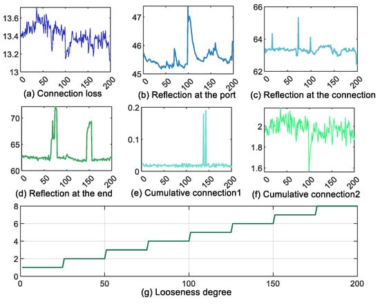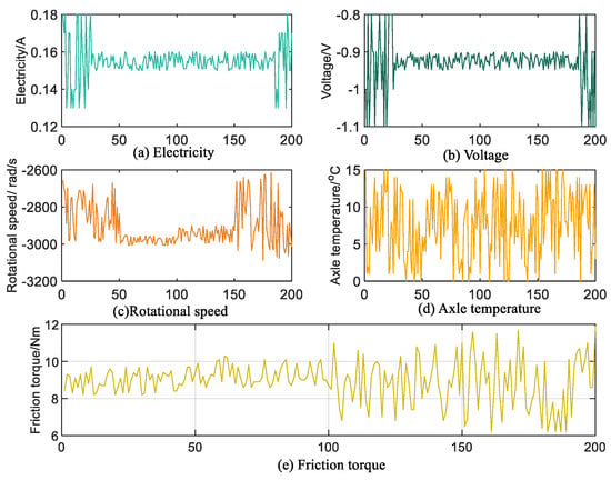 To verify the generalization ability of the model, the flywheel system friction torque fault is selected for the fault diagnosis case study in this paper. In the acquisition of indicators for flywheel system fault diagnosis, two observations of shaft temperature and friction torque can be obtained through temperature sensors and torque sensors deployed on the bearings, while three observations of current, voltage, and speed can be obtained through the motor. The friction torque failure of the flywheel system will directly affect the change rule of the shaft temperature and rotational speed of the flywheel. Friction generates heat, which can rapidly raise the temperature of the bearings, while the rotational speed of the flywheel changes weakly due to closed-loop control. To overcome the impact of friction torque on the motor output torque, the control system will increase the voltage and current of the flywheel. At the same time, it causes the motor output torque to increase, and the motor output torque is proportional to the flywheel speed. Ultimately, the closed-loop control stabilizes the flywheel speed around the target value, while the rotational speed is affected by current and voltage. The health and fault data of the flywheel used in this paper are the telemetry and simulated values of the flywheel observation variables, as shown in Figure 9.