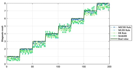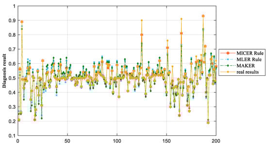 Eventually, the MICER Rule model in Section 3.2 is built and reasoned through, while the MLER Rule method in Section 2.1, maximum likelihood evidential reasoning (MAKER) [], and the traditional ER rule method are used as a comparative experiment, and a comparison of the final diagnosis results of the three methods is shown in Figure 7. The correlation coefficient calculated by the MLER rule is shown in Figure 8.