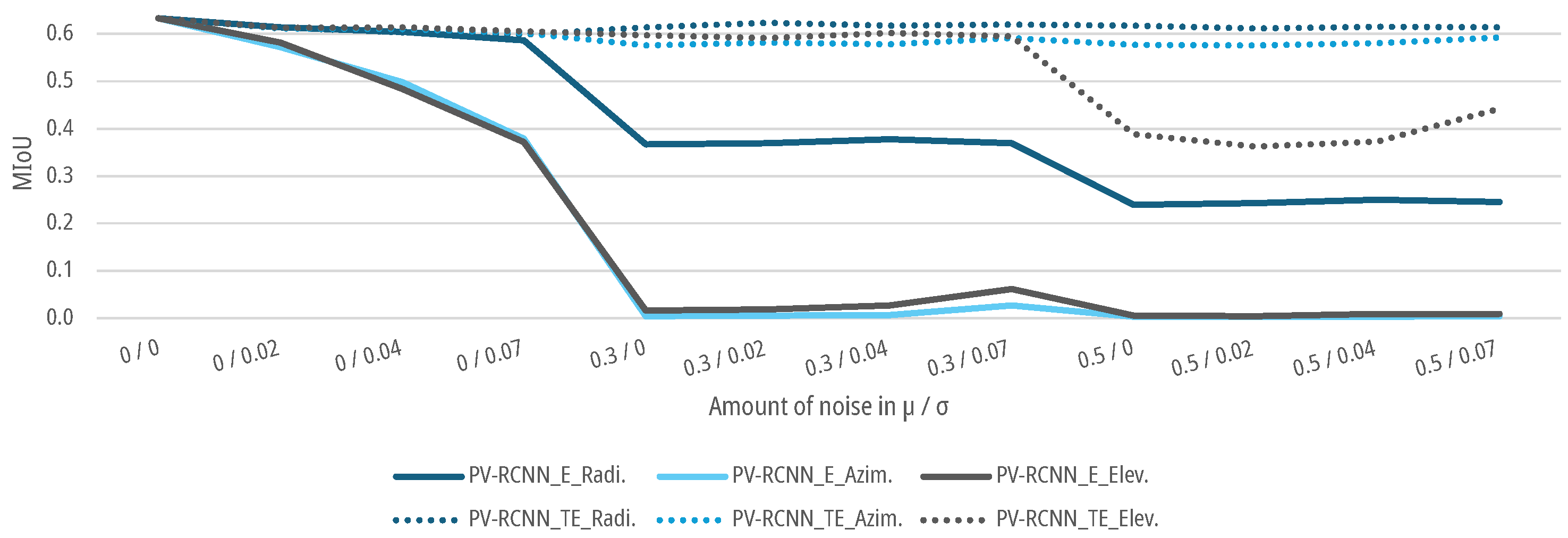 For the data sets with an augmented noise on the geometrical parameters of the point clouds, as described in Section 3.3, DNNs SECOND and PV-RCNN are again trained and tested for the E-case and TE-case. As shown in Figure 15 and Figure 16, the of both DNNs for the E-case drop to a of for azimuth noise and for elevation noise for the SECOND and for azimuth noise and for elevation noise for the PV-RCNN up to an augmented noise of and . The DNNs fall below the threshold for noise with a and with for azimuth noise and for elevation noise for the SECOND and for azimuth noise and for elevation noise for the PV-RCNN. For the radial noise, both DNNs for the E-case drop to a of for the SECOND and for the PV-RCNN up to an augmented noise of and . The DNNS fall below the threshold for noise with a and for the SECOND with and for the PV-RCNN with . In the E-case, both DNNs show significantly less sensitivity to noise in the radial measurement than in the azimuth or elevation measurement. For the TE-case, the of both DNNs drop only marginally to a of , , and for radial, azimuth, or elevation noise for the SECOND and , , and for radial, azimuth, or elevation noise for the PV-RCNN. This means that the DNNs can learn the task of people detection on data with noise on the radial, azimuth, or elevation measurement without significant degradation. The results of both models in the E-case show that has a more substantial effect on the models than the of the noise. This could be due to the voxelization of the deep learning methods. Due to the lower effective resolution and the averaging, is already relativized in the data processing before the actual DNN. At the same time, a propagates into the network and can only be compensated there to a limited extent. This is, as shown in Figure 15 and Figure 16, critical for the E-cases, as the model cannot compensate for the bias due to the lack of training.