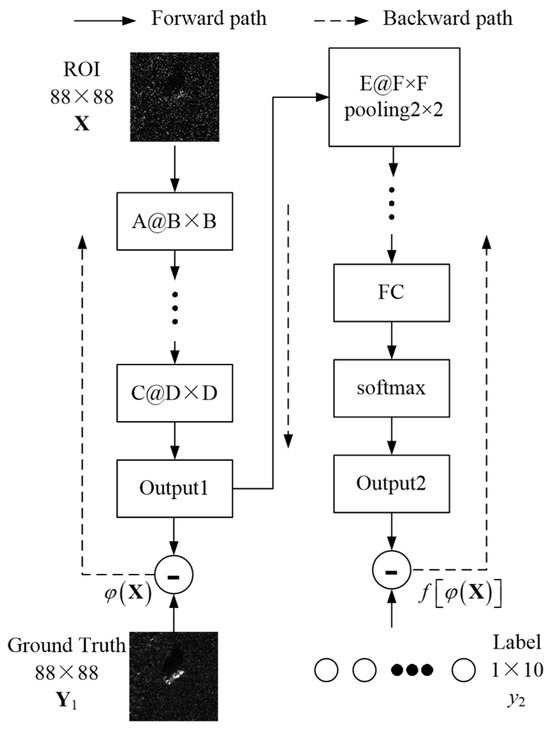 The J-CNN architecture proposed in Reference [20] addresses speckle-induced recognition degradation through synergistic despeckling–recognition integration, whose structure is shown in Figure 2. The architectural foundation of this framework lies in the synergistic integration between the despeckling module and recognition module. Through two-stage complementary feature processing, the robustness of the SAR target recognition model is improved. The J-CNN consists of convolutional layers, pooling layers, one full connection (FC) layer, and one softmax classifier. Concretely, the SAR images after synthesizing speckle noises, , are disposed by the despeckling process, which can improve the image quality. The despeckled SAR images, namely Output1, are expressed by . Then, the recognition results can be obtained by the recognition process, namely Output2, as . During model optimization, the stochastic gradient descent (SGD) framework synchronously processes dual-task objectives: the despeckling module computes reconstruction errors, while the recognition module evaluates classification discrepancies. These coordinated gradients collectively drive parameter updates through backpropagation. The unified backpropagation framework exhibits asymmetric gradient propagation characteristics. Recognition module parameters are governed by task-specific gradients excluding regularization terms, whereas the despeckling module updates incorporate interdependent gradients from both reconstruction and discriminative objectives. In view of this, the total loss function is designed as: