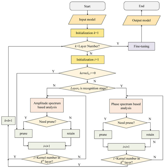 In the joint CNN design, there is a task-differentiated pruning mechanism that is introduced in the TDP-SAR framework. Stage-specific feature importance analysis is used to determine the pruning criteria. Recognition components concentrate on discriminative feature preservation, whereas the rest of the attention is given to spatial coherence patterns by the despeckling modules. Using the workflow visualization shown in Figure 3, this dual-task optimization approach automatically determines the kernel pruning configurations. Specifically, the model to be analyzed serves as the input for TDP-SAR, while the pruned final model constitutes the output. The procedure initiates by setting the layer index to k = 1. Prior to conducting convolutional kernel analysis for each layer, a conditional check is performed to verify whether the current layer index has exceeded the total number of model layers. When k is not more than the layer count, convolutional kernel analysis is executed; otherwise, the analysis process is terminated and proceeds directly to the fine-tuning phase. During the convolutional kernel analysis process, the kernel index of the current layer should first be initialized as i = 1. Subsequently, an evaluation is conducted to determine whether its magnitude values exhibit near-zero characteristics across all dimensions. If confirmed, this indicates the kernel has not contributed to the model’s functionality and can be directly pruned. For kernels demonstrating non-negligible magnitudes, a segmented rationality assessment of the workflow is performed to determine pruning eligibility. For despeckling layers, an amplitude spectrum-based assessment is conducted to determine convolutional kernel pruning eligibility, whereas for recognition layers, the evaluation is performed through phase spectrum analysis to ascertain whether the kernel requires pruning. This iterative implementation ensures all convolutional kernels across network layers are subjected to TDP-SAR pruning operations, followed by data-driven parameter refinement using training datasets, ultimately yielding optimized pruned model architecture.