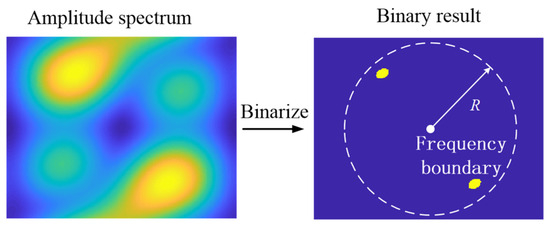 where Ph is the point number with a value of 1 in the high-frequency band after amplitude spectrum binarization and Pl is the point number with a value of 1 in the low-frequency band after amplitude spectrum binarization. Here, the division of high- and low-frequency bands is shown in Figure 4. Firstly, we binarize the amplitude spectrum and confirm the band boundary to R. Then, we can count the point numbers, i.e., Ph and Pl. Finally, the high frequency ratio can be obtained from Equation (13).