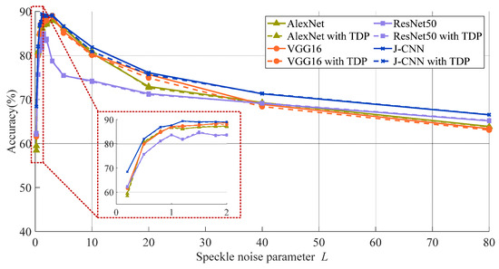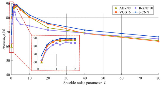 Section 2 highlights that in SAR images, the amount of natural speckle noise lowers the quality of the image and the degree of intensity in real world situations, but it varies. As such, we examine the effect of speckling noise in SAR target recognition models based on the CNN. Four SAR target identification models are trained and assessed. Figure 5 depicts recognition accuracies at various noise levels; the speckle noise level (L) is represented by the x-axis. (Higher L values point to worse SAR image quality.) Higher values of the image show a worse level of SAR.