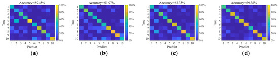 As described in the dataset section, model training samples consist of SAR images with simulated speckle noise at L = 1, 2, and 5. The accuracies are notably higher when test noise levels approximate these training values (L ≈ 1, 2, and 5). Even with high-quality SAR images (large L values), accuracy decreases significantly. This indicates that model performance degrades when testing conditions deviate from training parameters, revealing an overfitting problem in SAR target recognition. Nevertheless, J-CNN demonstrates superior adaptability to strong speckle noise compared to AlexNet, VGG16, and ResNet50. Particularly under L < 2 conditions (highlighted results), the accuracy of J-CNN becomes pronounced. Confusion matrices for all four CNN models with L = 0.2 are shown in Figure 6, where J-CNN achieves the highest accuracy (69.38%), reaffirming its exceptional noise robustness.