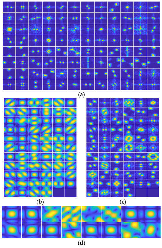 Figure 7 displays the amplitude spectrum of all convolutional kernels in the first layer across the four networks, standardized to 128 px ×128 px. Yellow and blue regions denote high- and low-energy-spectrum components, respectively. Granular artifacts in SAR images, i.e., speckle noise, predominantly reside in high-frequency ranges. Crucially, only 4 of the 16 kernels in Figure 7d suppress low-band signals while emphasizing high-band feature extraction. Compared with this case, the amplitude spectrum of the first convolution layer in AlexNet and ResNet50 shown in Figure 7a,c has a significantly smaller area of a high-energy region. Additionally, the extracted frequency range information illustrates the strong pertinence. However, for SAR images with strong speckle noise, strong pertinence may lose the overall information of the SAR target but highlight the expression of granular noise. Moreover, in Figure 7b, the amplitude spectrum of the first convolution layer of VGG16 has a large area of high energy, but the retention of low-frequency band information is obviously less than J-CNN. It will lose the information on target contour and shape information in SAR images.