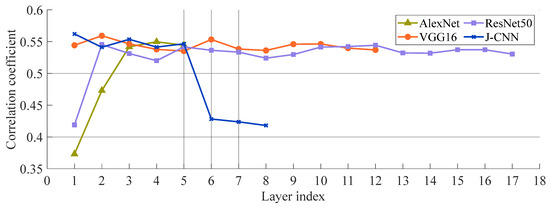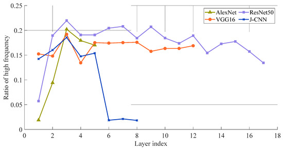 For a quantitative comparison of convolutional kernel amplitude spectra across the four models, Figure 8 layers the high frequency ratios using Equation (13), with hyperparameters thr = 0.7 and R = 70. The axes denote convolutional layer indices (horizontal) and high frequency ratios (vertical), excluding all 1 × 1 convolutional layers in this analysis. As shown in Figure 9, the J-CNN maintains elevated high frequency ratios across its first five convolutional layers, followed by a marked decline starting from the sixth layer. This aligns with J-CNN’s hierarchical design: its first five layers perform speckle reduction, while the final three layers constitute the classification stage. This structural dichotomy demonstrates that J-CNN’s speckle reduction phase actively preserves SAR target details, whereas the classification stage leverages generalized features for target identification, achieving balanced optimization of both objectives. Comparatively, AlexNet and ResNet50 prioritize general target information extraction in shallow layers (notably the first convolutional layer) while reserving detailed feature analysis for deeper layers. For SAR images affected by strong speckle noise, the low convolutional layer will extract more general speckle noise. Then, detailed information of speckle noise will be paid attention to in the deep layers. As a result, the adaptability is poor enough such that these models’ SAR images are affected by strong speckle noise. The high frequency ratio of VGG16 has little change with the deepening of the convolutional layers and always maintains a high level. It shows that VGG16 always pays attention to the extraction of detailed features in the high-frequency band. In the case of strong speckle noise, the details will affect the recognition results. Based on this, the reasons for the strong adaptability of the J-CNN to speckle noise are analyzed from the perspective of the convolution kernel amplitude spectrum.